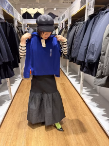 計画では、この鮮やかなブルーと、ナス紺っぽいベロアイージーパンツを合わせて、その上に黒のジレやキャミソールなどを合わせる予定。