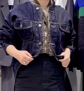 デニムジャケットには珍しいノーカラーになり、後ろ姿は襟がかなり個性的。